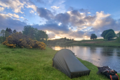 I am not exactly sure why I decided I wanted to complete the walkway today. Because it was do-able? Because it kept the momentum going? Because I was stubborn and liked a challenge? Because there were no convenient campsites on route so I may as well keep going? Probably all the above. After a slight unintentional detour around the edge of Lanark, I finally reached New Lanark at around 7.30. It is a strange and beautiful place. A World Heritage site apparently. I’m not big on history but by the sounds of it, David Dale the original founder was a decent mill owner who built the village to house and otherwise support the wellbeing of his workers. Now there’s a thing. All the stone buildings looked picture-perfect, making me wonder what it was like to live there. I’d imagine there were a few rules. As there was nowhere open, I carried on the climb towards the Falls of Clyde. While there were one or two vantage points of the river where the water cascaded down rocks, there was no dramatic Niagara Falls style vista. Though to be fair, the light was starting to fade. It was all very pleasant although by now I was perhaps starting to get pre-occupied with where I was going to camp. Further still along the river I reached Bonnington Weir and simply on the basis that the waymarkers now had arrows just pointing one way rather than both ways, I decided that this must be the end of the walkway. It would do. Again I found it really strange that the authorities don’t make a big deal of it. THIS IS THE START/END OF THE CLYDE WALKWAY!!! Move on, Adam. After walking a few hundred yards I spotted a couple pitching a tent in a field by the river. I went over to have a word and after a discussion as to whether it was okay to camp there, I decided to go for it as well. Maybe safety in numbers was at the back of my mind. At the front of my mind was how gobsmackingly gorgeous the place was. The sun was setting, the Clyde just seemed to be drifting slowly by, and I had a Chili con carne to eat. This was why people wild camped. It was absolutely idyllic. I gave the couple a fair bit of space and even managed to find a gorse bush to hide me from the road.